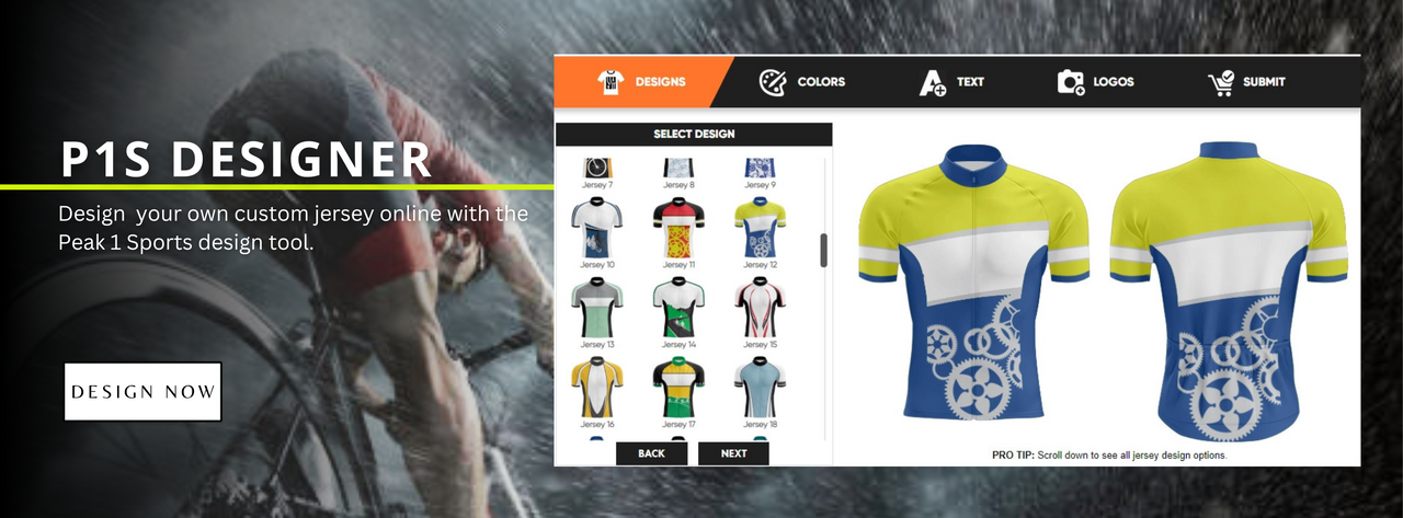 Create a unique cycling jersey design with a full custom design. The Peak 1 Sports graphics department can create a jersey design from a concept, idea, or image. We can turn your idea into a reality!